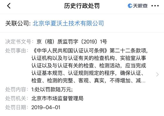 另据天眼查,盒马超市有机青菜和有机豌豆苗的认证机构——北京华夏沃土技术有限公司(以下简称“华夏沃土”),曾在2019年4月因违反《中华人民共和国认证认可条例》第二十二条被罚款6万元。而华夏沃土曾用名为北京五岳华夏管理技术中心(以下简称“五岳华夏”),据媒体报道,2018年5月,五岳华夏认证的某有机食品公司被央视曝光生产不合规,当月,五岳华夏发布公告称,注销上述有机食品公司有机产品认证注册资格,并收回有机认证证书7张。