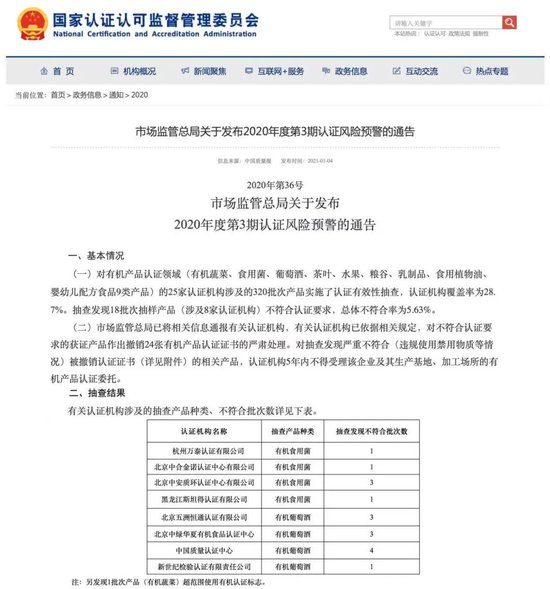 北京商报记者查询市场监管总局通告发现,2025年3月,在总局对有机产品认证领域的40家认证机构涉及的150批次产品实施认证有效性抽查时,共有11批次抽样产品不符合认证要求。其中,北京五洲恒通认证有限公司认证的有机产品占了4批次。