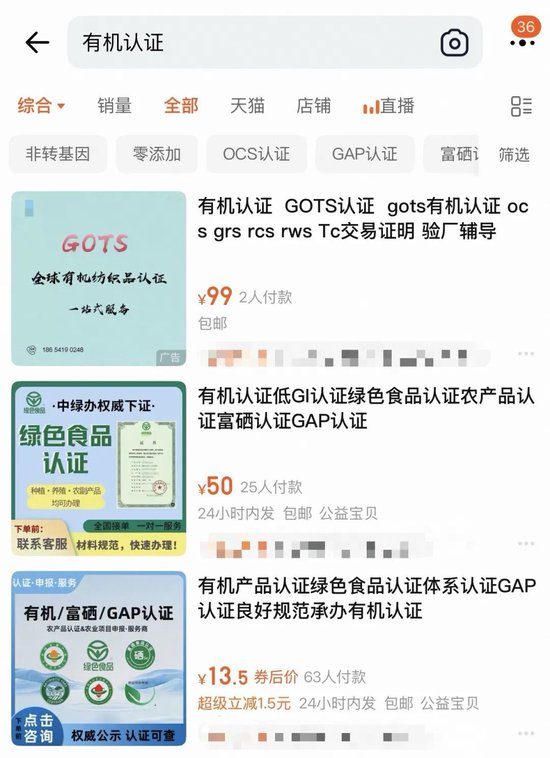 一商家对北京商报记者表示,有机认证代办服务并非统一定价,而是依据对接的认证机构的“档次”划分收费标准,而认证机构的“档次”主要参考的是其市场公信力和检测严格程度。例如,一档对接的是行业认可度高的头部机构南京国环有机产品认证中心有限公司,其发证起步费用就是1.5万元;二档对接的是中绿国证(北京)认证中心有限公司,发证全包费用近2万元;三档为安徽国科检测科技有限公司,发证全包费用在1.5万元左右。